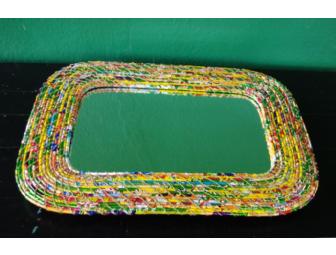 Delightful fair-trade mirror made in Bangladesh with a frame made from jewel-colored recycled candy wrappers. You can also use it as a centerpiece base to reflect the light of candles. Hanger on back. 19" x 14 “