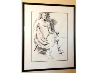 This female nude done in charcoal on paper is matted and framed in a simple black frame. The image size is 18" x 24". The framed size is 24.5" x 31.5". It was purchased and signed (circa 1992) by the artist in her studio.