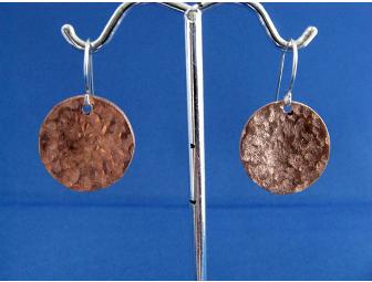 This is a pair of hand cut, polish and textured copper earrings. The disc measured 5/8" in diameter Finished with 0.925 sterling silver wire.