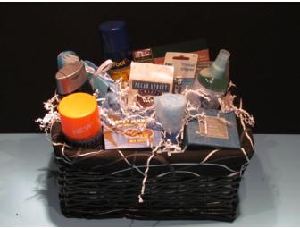 Pamper Dad with this great assortment: body wash, shampoo, conditioner, shaving cream, foot powder, lotion, pedicure paddle, grooming tools for hands and feet, microfiber hand towel, satchel, pralines and Harry & David Moose Munch.