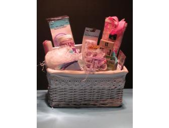 A lovely basket to pamper a special lady: bath sponge, an assortment of bath salts, lotions, soaps and shower gels, pedicure paddle, microfiber facial scrubbers and hand towel, bath glove, terry headband, makeup remover wipes, cold cream, scented sachets, and an anti-stress comfort wrap, plus pralines!