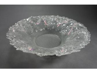Original art glass bowl, signed by the artist, Jane Skeeter. Inspired by the sky at dusk as twinkling stars appear through wisps of clouds, the piece icludes dichroic inclusions and is enhanced by its very textural surface. It may be enjoyed as an iconic art display and may be used to hold additional treasures. 16" diameter