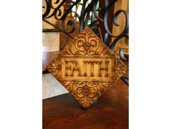 Enjoy this basket of items that are sure to inspire faith! Includes four sermon series CD sets by Pastor Scott Rambo and Associate Pastor Kenny Dean of The Bridge Fellowship; chic brown, frayed women's cap with cross made of pink and iridescent Swarovski crystals; and elegant "Faith" wall plaque.