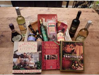 Bring home a taste of Italy with this cornucopia of Italian favorites. Our basket features two select Italian reds, two select Italian whites, extra virgin olive oil, balsamic vinegar, a pesto spread, Mario Batali’s Marina pasta sauce, garlic parsley fettuccine, hand-painted earthenware anti pasta plates, a blown glass wine stopper, Marcella’s Italian cookbook, Patricia Wells’ Trattoria cookbook and The Italian Wine Guide.