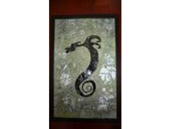 A 22"x14" mosaic created by artist, Tamara Ribas using paint, tempered glass and grout.