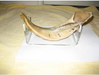 Authentic shofar on lucite stand. Shofar measures 9 ½” long and 4 ½” high with stand. Lucite stand is 7 ½” long.