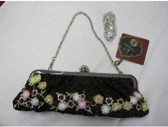 Versatile and Gorgeous! Brown satin dress purse. Can be worn as a clutch, or with detachable silver chain shoulder strap or short silver chain handle (all included)