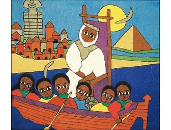 This gorgeous embroidery, sewn by Ethiopian Jewish artisan Asnakew Motbaynor, depicts the journey of Ethiopian Queen of Sheba across the Red Sea for her historic meeting with King Solomon in Jerusalem. The Queen is sitting thoughtfully in her traveling throne as she is rowed past Ethiopian villages and Egyptian pyramids.