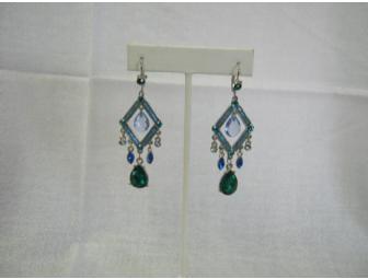 Pierced earrings that dangle and sparkle with blue and green crystals.