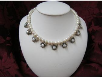 Gorgeous Fresh Water Pearl Necklace features detailed Sterling Silver drops holding additional pearls. Sterling Silver clasp sports additional pearl.