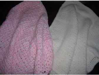 Baby-style blankets, 25' by 25'. One soft pink, V-stitch, and the other off white, basket weave stitch.