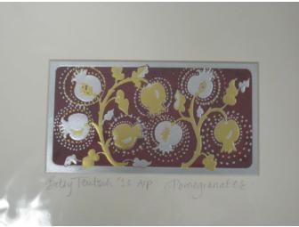 Pomegranate lithograph print, gold/silver foil stamped & embossed on burgundy background, beautifully matted, 8x10 inches.