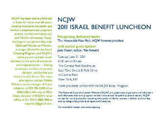 This year's NCJW Israel luncheon, Tuesday, June 21 11:30am-2:00pm at the Central Park Boathouse in New York City, will recognize the Honorable Nan Rich, NCJW honorary president and Florida Senate Democratic Leader. Special guest speaker is Jane Eisner, a pioneer in journalism and The Forward's first woman editor.