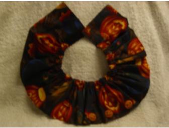 Adorable Halloween themed neck ruff for your fluff! Elastic on inside border makes it a 'one size fits most Bichons'. Velcro closure. Three plastic pumpkins afixed to the ruff make it extra festive!