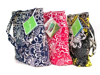 Auction winner will receive three (3) quilted totes in Baroque, Twirly Birds Pink, and Twirly Birds Blue. With three brilliant colors and unique patterns, this gift is sure to please.