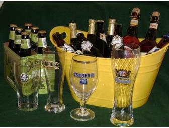 What’s more fun than a barrel of monkeys? How about a party tub of beers! This item is an international selection of 22 beers and ales, four logo glasses to go with them, four handmade coasters and a yellow party tub to chill them. Beers include: a six pack of Dundee India Pale Ale and glass; a six pack of Sam Adams beers; a 750 ml bottle of Hennepin Belgian style beer and glass; a 750 mL bottle of imported Affligem Belgian Abbay beer; five pints (various styles) of imported Bavarian beers with glass; and three pints (various styles) of imported English beers and ales with glass.