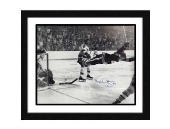 Bids are for a limited edition Bobby Orr hand-signed and framed 16x20 photo. Bobby Orr, a Boston Bruins Hall of Famer and one of hockey's greatest defensemen, is best remembered for the game winning goal he scored in the 1970 Stanley Cup Finals. Shortly after putting the puck in the net, Orr was upended and sent flying. The cameras went off and recorded "the goal," one of the most famous of all time. Item comes professionally double-matted and framed. Certificate of Authenticity included.