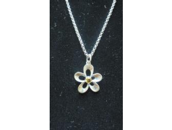 James Avery has been in the jewelry-making business since 1954 and his sterling silver designs are now seen nationwide. As the winner of the auction, you could be the proud owner of another one of these classic pieces. The charm is a sterling silver flower set with a citrine stone, and hangs on a delicate silver chain.
