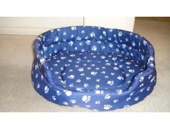 Oval dog bed made of navy blue nylon with light blue paw prints. Interior measurment is 23"x19". One piece construction. Comfortably fits a dog up to 30lbs.