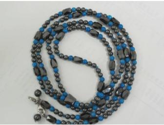 Necklace, 40" long, is made up of turquoise seed beads and round and faceted gunmetal beads.