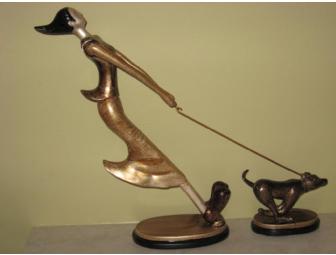 This is an abstract sculpture of a dog walking his lady!