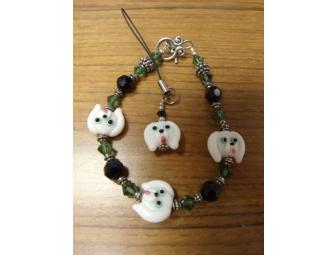 Beautiful dark green, burgundy & silver bead work contrast w/white doggy beads (face is on front & back) on a 7 1/2 “ bracelet and cell phone charm. Very pretty.