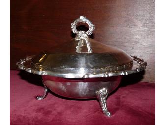 Antique silver-plate casserole with lid, lined with Pyrex glass bowl.