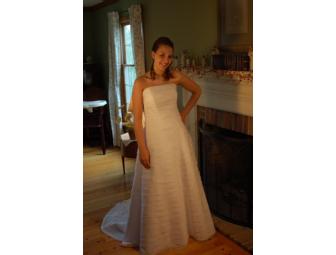 This dress is a two-in-one layered organza gown from David's Bridal.  It is a size 8.  It would be a the perfect dress for any girl's special day.  Sweep Train, fully lined, back zip, white from David's Bridal Collection.
