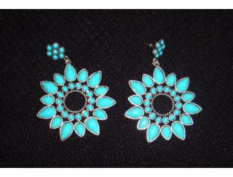 These eye-catching earrings feature manmade turquoise and silvertone metal. The posts and clear backings offer easy and convenient wear.