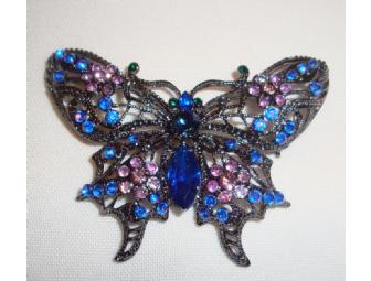 This lovely butterfly pin features beautiful manmade gemstones in purples and blues set against silvery-black metal.