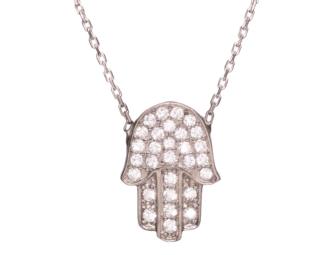 Sterling silver hamsa necklace with cz stones. Looks just like the real thing, but without the price attached! Hamsa necklaces are worn for good luck and good fortune. Chain is 18".