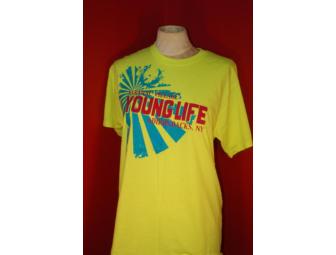 Saranac Village Young Life Large T-shirt Neon Yellow with Aqua/Red letters