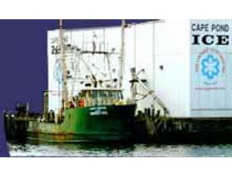 It's all right at the historic Cape Pond Ice Company on Gloucester's working harbor. Photo display of the making of the movie The Perfect Storm, including the fake Crows Nest at the Heritage Center and and Bugsy wearing the Cape Pond Ice Company t-shirt in the movie. As part of the tour they talk about their role in the Perfect Storm book & movie, what it was like when Warner Bros was filming in Gloucester, the importance of ice for the boats like the Andrea Gail to keep the catch fresh, how Sebastian Junger talks about the ice industry, the Cape Pond Ice Company's history and facility. They also play clips from the Perfect Storm movie in the tour, as well as video of historic ice harvesting, and end with four Cape Pond Ice TV commercials.