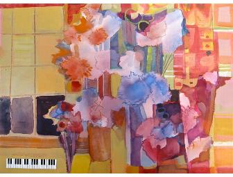 This framed mixed media watercolor painting is entitled "The Arrangement". What better remembrance of the Mendocino Music Festival, with its musical reference! As Karen explains, "For me, painting is a practice, an exercise of color, shape, value and purpose. Practice time is a chance for new workâ¦. an expansion of perspective, a purpose clarified, a willingness to keep optimism present. This is why I paint and what I hope to convey. Inspiration: This piece began as a painting demonstration for a workshop I held in my studio. I view almost all my work, landscapes, seascapes and floral pieces as "arrangements," oftentimes with thought to the title of a favorite song. This arrangement was inspired by the Mendocino Music Festival." Karen is a local artist, known for her development of personal style and her fresh approach to watercolor. She has earned top awards in juried shows and was chosen as an Artist-in-Residence at Yosemite National Park. Her work can be seen in her studio, by appointment, and at Mendocino Art Center. Visit her website: karenbowersstudio.com. Highly collected, Karen is a permanent member of 5 galleries in the area, and teaches workshops in watercolor painting in her "High Tower Studio" and elsewhere. Image size: 11" x 15"
