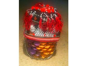 Purchased by the donor in a Hmong village in Vietnam in 2003, this hat has exquisite detail with 10 small red pompons on the top of the hat and many black and white beaded tassels with red threads scattered around the crown. It is embellished with silver bead work; a 10 cent coin with two small silver beads is sewn on the black fabric of the hat. Primarily black, red and white colors are seen throughout the hat. The black head piece is fully lined with a machine sewn red, white and black striped 1/2" trim around the bottom of the hat. The chin strap consists of small black and white beads