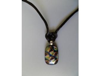 Hand-made, wearable art, this one of a kind fused glass pendant on satin string dazzels in any amount of light. The piece is 1/2" by 3/4" on a 12" satin string.