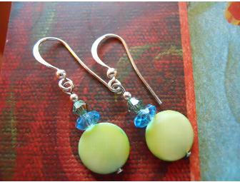 Swarovski crystals in turquoise and green are on top of round spring green shells. Very light and easy to wear, approximately 1 inch in length. Sterling Silver French hook.