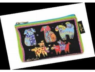 This zippered cosmetic bag features a multicolored design of dogs and measures 9x1x6.