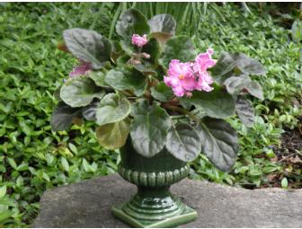 Fancy African Violet: This violet is named, "Leading Lady" and was purchased as a slip at the Philadelphia Flower Show. The leaves are solid green. The petals have a purple outline just inside a frilly white edge. The body of the petals have lavender and pink tones with bright yellow stamens. It is housed in a green ceramic footed urn.