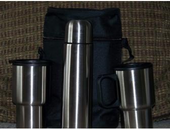 Rhe thermos holds 17 oz and the mugs hold 14 oz, and comes w/ zippered carry case. New.