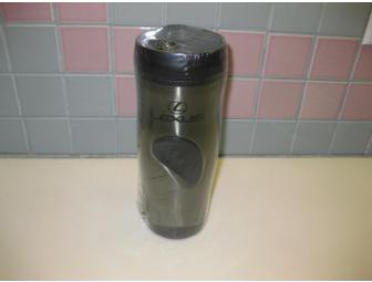 Silver tone 8" tall coffee mug with rubber grips on either side.