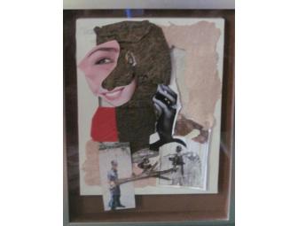 This moving collage by Gloucester artist Joy Dai Buell is inspired by the politics of Central America. 14" X 18" X 2" deep, in the boxed style of Joseph Cornell, this collage contains ripped and torn surfaces surrounding images of police, the madonna and royalty, surrounding a disembodied chicken foot.