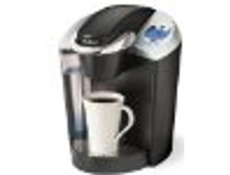 Keurig coffee maker! K-cups refill coffee, 2 travel mugs, box of lime/orange tea, box of sipping chocolate, jar of honey, sugar cookies, box of peach apricot tea, tea ball, Godiva milk chocolate caramels, Godiva biscotti, Brookstone frother, Sulpice fancy chocolate, chai tea, waffles.