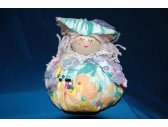 Hand-made with love, this little lady pin cushion will keep your sewing projects organized. She holds the pins and needles for you while you sew or mend!