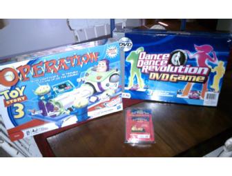 3 brand new games that include a "trivia on the go" card game for kids ages 5 and up— with 50 different trivia cards, or 1000 different trivia questions; "Toy Story 3 Operation" which is a silly skill game involving favorite Toy Story Pixar characters- ages 6 and up; and lastly "Dance Dance Revolution the DVD game- where exercise gets fun" with 30 different dance sessions for ages 5 and up.