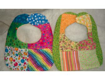 These precious, cheery baby bibs are constructed with cotton fabric and are filled with all natural, unbleached, cotton batting. The pieces are an assortment of fabrics dating from the 60's to the present. They are all quilted and have snap closures.