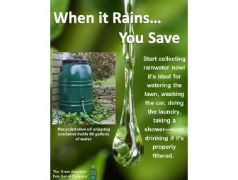 When it Rains...You Save! Ideal for watering lawns, washing the car, even drinking if it's properly filtered. Rigid heavy duty rain barrel (recycled olive shipping container), large capacity-holds 60 gallons of rainwater.