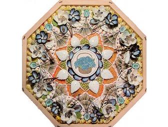 Created for Barnstable Land Trust, this sailor's valentine features both local and exotic shells, which surround a colorful scrimshaw of Nantucket's trademark basket filled with hydrangeas.