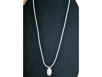 Freshwater seed pearls hand strung with a sterling silver chain/clasp and a fleur de lis sterling pendant