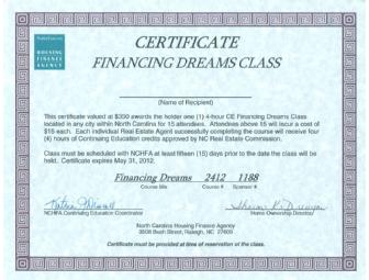 This offer is for one(1) 4-hour CE Financing Dreams class located in any city within North Carolina for 15 attendees. Attendees above 15 will incur a cost of $15 each. The class must be scheduled with NCHFA at least 15 days prior to the date that the class will be held. This offer expires May 31, 2012.